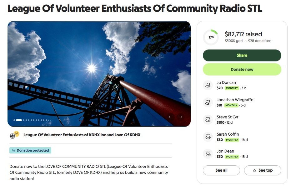 Our Gofundme is still live, and you can still donate there — both one-time gifts and monthly donations. If you haven’t donated yet or want to make an additional gift, there’s no time like right now. Thank you for all that you do for community radio in St. Louis!